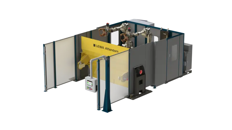 Die SD-750 FW SPOT, verfügbar als Einzel- oder Doppelroboter-Zelle, setzt auf horizontale Rotation, ähnlich einem Ferris-Wheel-Prinzip und bietet Ihnen besonders bei größeren oder unzugänglichen Bauteilen klare Vorteile in Taktung und Ergonomie.