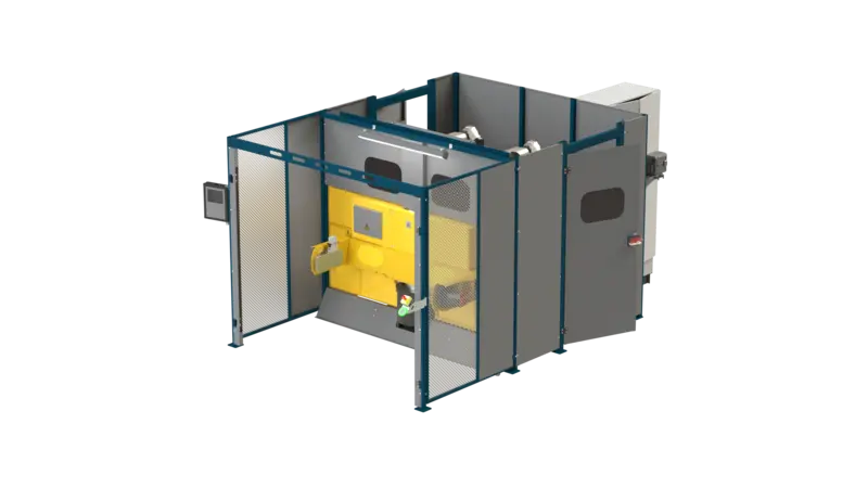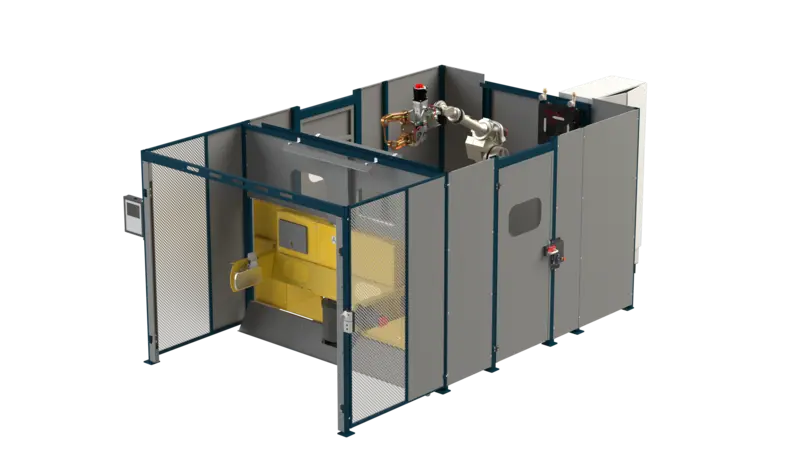 Die SD-750 FW SPOT, verfügbar als Einzel- oder Doppelroboter-Zelle, setzt auf horizontale Rotation, ähnlich einem Ferris-Wheel-Prinzip und bietet Ihnen besonders bei größeren oder unzugänglichen Bauteilen klare Vorteile in Taktung und Ergonomie.