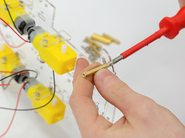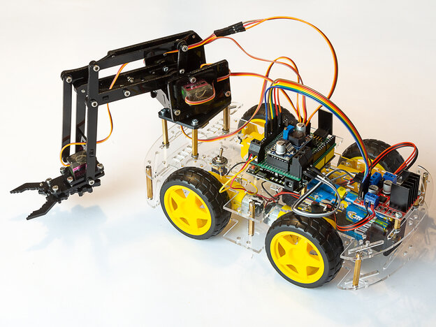 Für Schüler*innen der 10. und 11. Klasse. In drei Tagen baut Ihr jeweils einen app-gesteuerten Roboter auf vier Rädern. Der fährt aber nicht nur, sondern hat auch einen steuerbaren Greifarm.