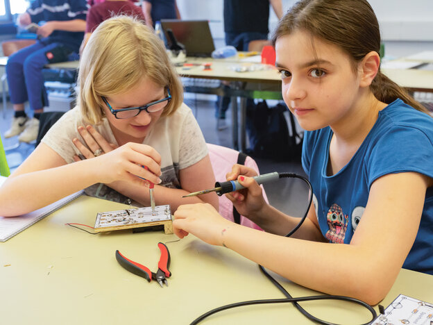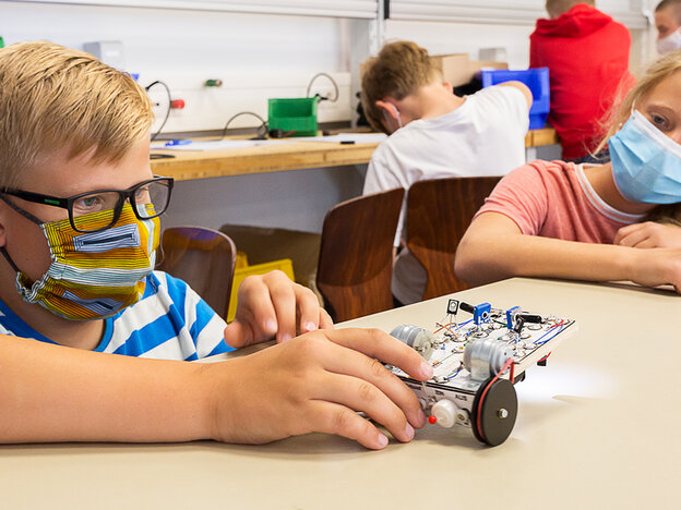 Für Schüler*innen der 6. und 7. Klasse. Ihr werdet zu Mechatronikern, die mit den Mitteln der Mechanik und Elektronik ein Fahrzeug konstruieren, das per Licht gesteuert wird. Natürlich arbeitet Ihr im Team. Wisst Ihr nicht weiter, helfen wir euch.