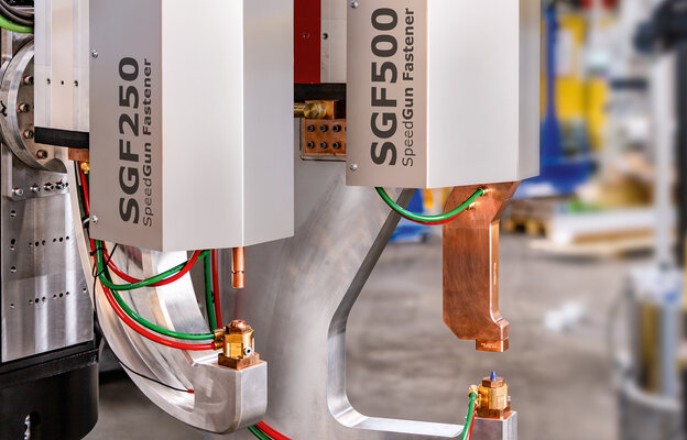 The SpeedGun® was developed for automated joining processes with high cycle rate requirements. Its servo-electric drive technology, low weight, and direct control via the robot controller enable short cycle times with high repeat accuracy. These capabilities are also available in compact cells with high cycle density.